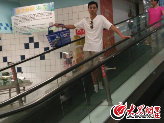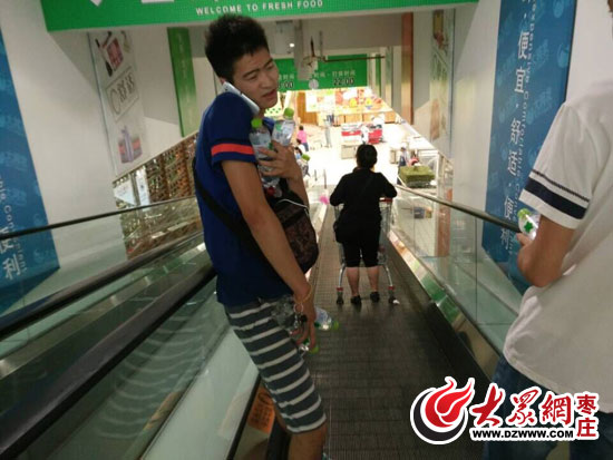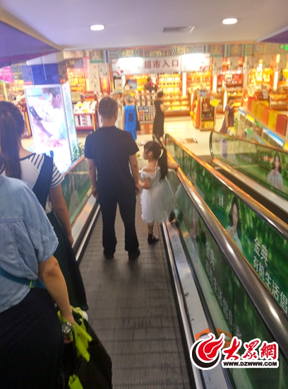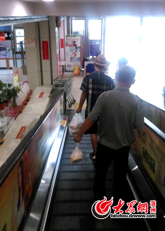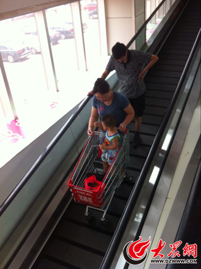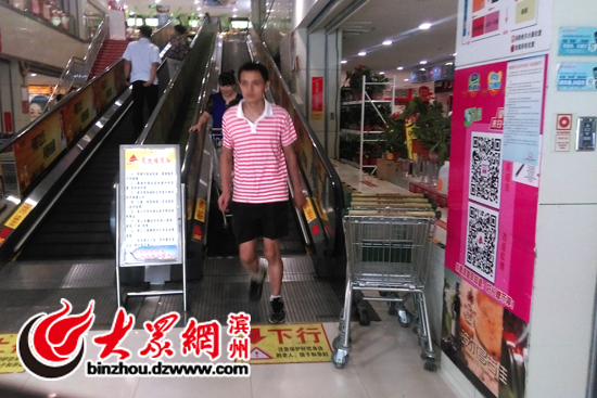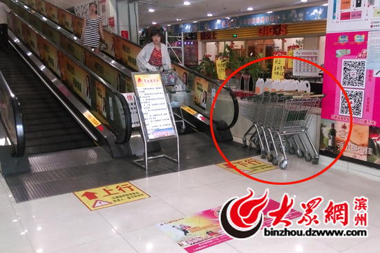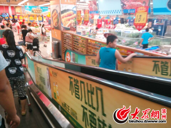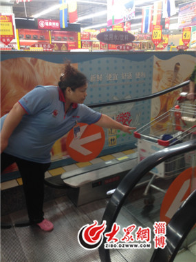 28日下午,大眾網(wǎng)記者在淄博大潤發(fā)超市二樓采訪時發(fā)現(xiàn),扶梯口有工作人員在幫顧客從扶梯口處拉購物推車,當(dāng)有孩子從電扶梯下來的時候也幫忙看管下調(diào)皮的孩子。