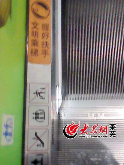 記者在位于濟寧市金宇路的貴和購物廣場看到,電梯兩側(cè)全透明設(shè)計,每層的扶梯上雖然設(shè)有紅色按鈕,但沒有醒目的“緊急停止按鈕”提示標(biāo)示與提醒。另外,記者發(fā)現(xiàn)除在扶梯上升處貼有的“照顧孩童”、“勿跨扶手”、“勿追逐打鬧”等七個半透明提示語外并沒有其他醒目的安全提示標(biāo)語,并且每部扶梯的臺階上都沒有用黃色警戒線標(biāo)示出危險區(qū)域。