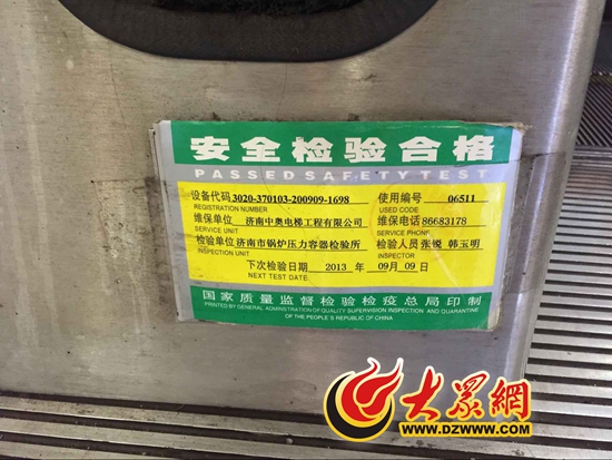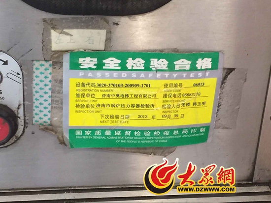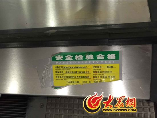 青島萬達(dá)CBD店通往佳世客超市的電梯安檢期限為2013年11月7日,已超期近兩年。