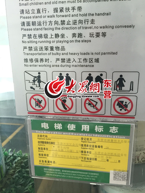 正值上午,乘坐電梯的人并不多,8部扶梯客流量較小。記者看到,電梯標(biāo)志包括注冊使用標(biāo)志包括注冊代碼、登記機關(guān)等均比較齊全,下次檢驗日期為2016年2月。每部扶梯的周圍均張貼規(guī)范乘梯的宣傳標(biāo)識。