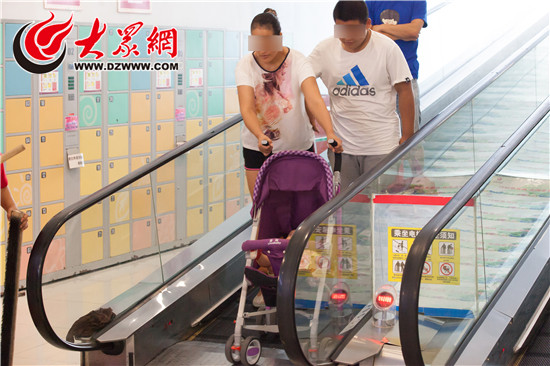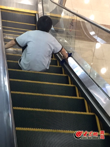 28日上午,大眾網(wǎng)記者實地調(diào)查了青島萬達(dá)CBD店、海信廣場等五家大型商場,在青島萬達(dá)CBD店,記者發(fā)現(xiàn)一位清潔工在擦拭電梯部件,但該清潔工并未按下紅色停止按鈕,而是直接蹲在電梯上,一路搭乘電梯用抹布擦拭電梯階梯與扶手欄的銜接處,令人十分擔(dān)心抹布擠進階梯縫隙。此外,還有不少乘客將嬰兒車、推車等直接推上了電梯,而電梯旁的警示標(biāo)志明確表明禁止嬰兒車、手推車進入電梯。