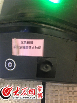 28日20點左右,大眾網(wǎng)記者來到了位于張店區(qū)華光路上的彩世界廣場,從正門進入大廳后乘坐西側(cè)扶梯來到二樓后,發(fā)現(xiàn)電梯紅色緊急停止按鈕旁邊有“應(yīng)急按鈕 非緊急情況禁止觸碰”字樣,而紅色按鈕卻被貼上黑色膠紙,如此一來,緊急停止按鈕更被隱藏的“不為人知”。