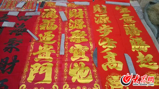 過春節,幾乎家家戶戶都要貼春聯。春聯意味著沾喜氣,除晦氣,營造節日的熱鬧場面,寄托吉祥美好的愿望。年前,大眾網記者回到家鄉臨沂市郯城縣李莊鎮八里屯村。臨近春節,農村大集上,春聯擺滿了大街,叫賣聲傳遍了整條街道。什么掛式的、噴金的、帶龍鳳的……雖印刷精美但內容千篇一律!艾F在賣的春聯都是印刷的,再也看不到手寫的啦!”同行的父親感嘆了一聲。