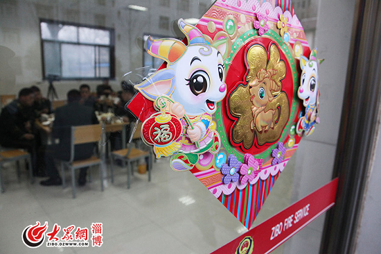17點整,一聲電鈴響徹大院,今天執勤保衛城區平安的特勤中隊戰士們喊著整齊的口號列隊走進食堂。淄博市公安消防支隊黨委書記、代政委崔連勝也到食堂與全體消防戰士一起吃年夜飯。