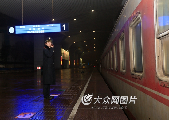 2月19日大年三十凌晨零點15分,濟南站客運車間客運值班員王宗遠在目送濟南至福州K67次列車出站,長長吁了一口氣。90年出生的王宗遠2012年參加工作來到濟南鐵路局,今年是第一次趕上大年三十夜班。為了讓旅客能順利、安全的登上最后一趟回家的列車,王宗遠從19點接班開始,就每個站臺來回跑,不管哪個站臺有車,他都要跑過去,親自迎送列車進站出站,主動盯控旅客乘降組織。