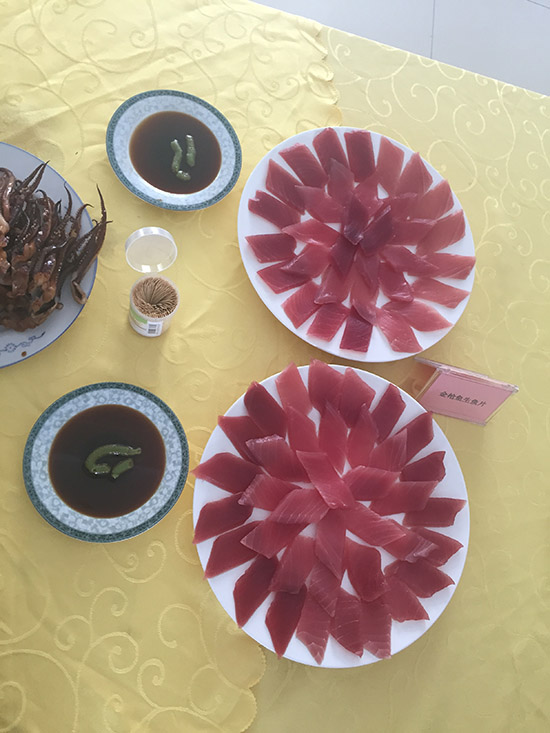 除金槍魚罐頭加工,藍潤還擁有一個金槍魚加工車間,在這個車間,工人主要是對金槍魚進行粗加工,按照不同部位對金槍魚進行切割。粗加工完成的魚肉將包裝好被運到各地餐廳,然后經過廚師的加工變成鮮美的生魚片。一個車間30多人日處理金槍魚達到10噸。工作人員介紹,適合做生魚片的金槍魚包括藍鰭金槍魚、馬蘇金槍魚、大眼金槍魚、黃鰭金槍魚等。