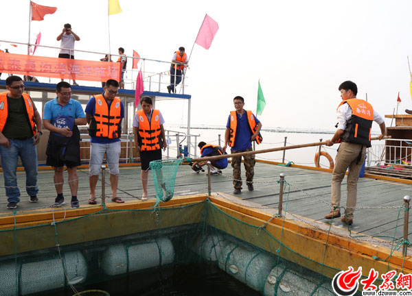 從一樓的池中撈出一條河豚,拍拍它的肚子,漸漸地鼓得像個白球,引得記者一陣陣歡笑。玩累了,一盆剛出鍋的海鮮大雜燴上桌,七八個人圍坐在一起,吃得不亦樂乎。吃完海鮮再來體驗一把海上垂釣,沒有魚鉤的釣竿,讓記者們充滿懸念。
