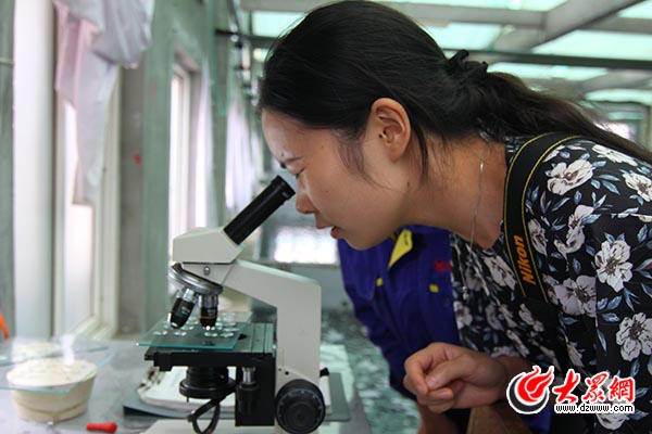 媒體記者通過顯微鏡觀察海帶種苗生長情況
