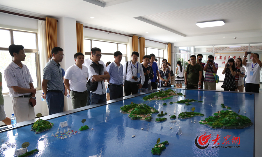 采訪團(tuán)在長島海釣基地的長島縣沙盤前聽取長島情況介紹。記者 孫晨 攝
