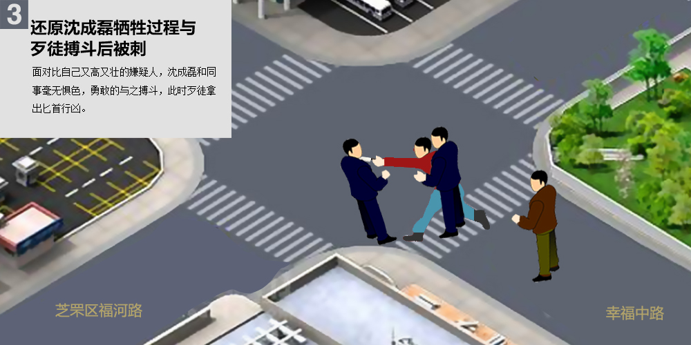 面對比自己又高又壯的嫌疑人,沈成磊和同事毫無懼色,勇敢地與之搏斗,此時歹徒拿出匕首行兇。