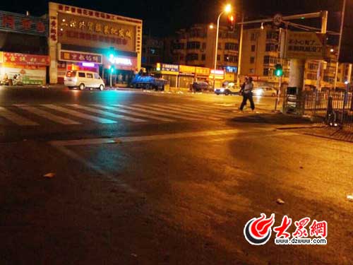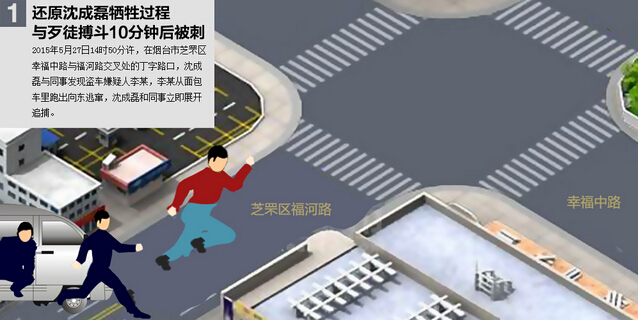 在距事發(fā)地10多米處有一個修鞋攤,修鞋的李大爺告訴大眾網(wǎng)記者,27下午2點40分左右,幸福中路一輛面包車?yán)锿蝗慌艹鰜硪粋身材壯實的小伙子,還有兩個人緊跟在后面追。三個人沿幸福中路由西向東跑,后面追的倆人兩次上前制服前面的小伙,但是都被小伙掙脫了,掙脫的小伙子拿出匕首嚷嚷著:別過來,過來就弄死你!當(dāng)后面兩個人第三次上前時,三個人糾纏在一起搏斗。突然,其中一個人就倒在了地上,渾身是血,那個年輕小伙撒腿就跑了。
