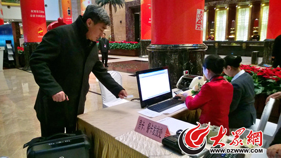 參加山東省政協十一屆三次會議的政協委員陸續抵達濟南住地向大會報到。大眾網記者在報到現場看到,報到手續簡便高效,秩序井然,大約1分鐘即可完成“一站式”報到。省政協委員們帶來了自己的提案,也帶來了對“新常態”下山東發展的期待。