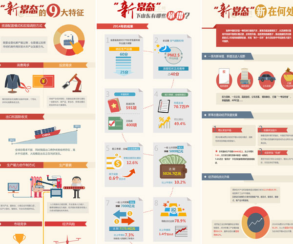 新常態的誕生、新常態九大特點、新常態對我們意味著啥……今年的兩會報道中,大眾網通過“圖話”新聞,以圖表、漫畫等形式和詼諧活潑的語言對“新常態”進行解讀,專家口中和會議報告里的名詞將脫離“高大上”,變得更加接地氣兒,與每一個普通百姓的生活息息相關。會議期間,本網記者還將在會場內進行“街坊”,把代表、委員們對新常態的理解制作成微視頻,網友們只需輕輕點擊,就能在電腦和各種移動終端上隨時聆聽來自會場的聲音。