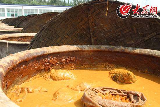 9日上午,大眾網(wǎng)記者來到了位于山東省濟(jì)寧市濟(jì)鄒路上的玉堂醬園生產(chǎn)基地。3000余只醬缸整理的排列在釀曬場(chǎng)上,今年61歲的老師傅張廣民告訴記者,只有用保持了三百年的傳統(tǒng)工藝,才能釀造出獨(dú)居風(fēng)味的玉堂醬菜,每一缸、每一包醬菜都要在這里經(jīng)過至少半個(gè)月的自然釀曬、人工翻倒。