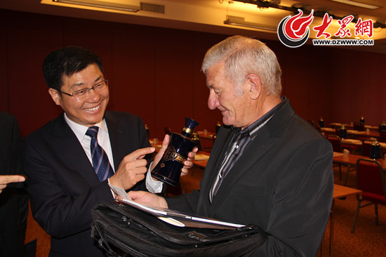 山東景芝酒業品牌總監李亦民向海外媒體記者介紹一品景芝。