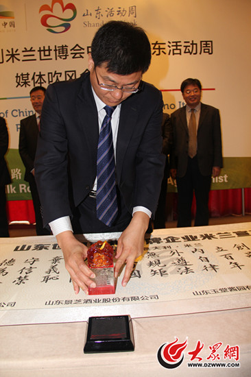 山東景芝酒業品牌總監李亦民在《米蘭宣言》上蓋印,承諾誠信經營,嚴把質量關。