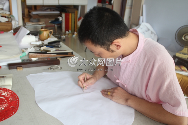 國家級非物質文化遺產剪紙項目傳承人李金波接受大眾網記者采訪。