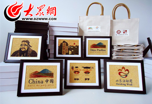 在組委會的“指示”下,韓國瑞制作出一批與米蘭博覽會相關(guān)的糧畫工藝品,包括《中國館標(biāo)志》《山東活動周標(biāo)志》《吉祥物和和夢夢》及代表山東文化的《泰山》《孔子》,經(jīng)組委會確定,這些作品成為山東周活動的紀(jì)念品。同時,韓國瑞制作了代表意大利文化的《比薩斜塔》《古羅馬斗獸場》等作品。