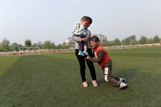 除此之外,幾乎每天都有的體育課,孫英也必須到學校陪兒子。別的孩子在操場打球跑步,孫英就帶兒子在旁邊練習走路。