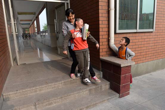 鈴聲響起,孩子們像小鳥一樣快活地叫著從教室里飛奔出來。等這些歡塊的小鳥“飛”完,孫英快步走進教室。坐在最后一排、一直盯著教室門口的一個男孩看到了快步走來的孫英,臉上露出了甜甜的笑。他下意識地向前挪動了一下,卻沒能站起來,他輕輕喊了一聲“媽”,把雙臂伸向了孫英。