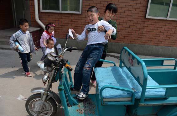 從孩子上學那天起,孫英就開始了陪讀之路。每天早晨7點半,她要用三輪車把兒子送到學校,然后趕回家照顧小兒子。兩節課后,再次趕到學校幫兒子上廁所。中午11點50分,要到學校接兒子回家吃午飯。下午1點30分,把兒子送回學校,一節課后,再到學校幫兒子上廁所。下午4點20分,最后一次來學校把兒子接回家。
