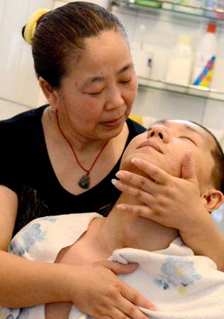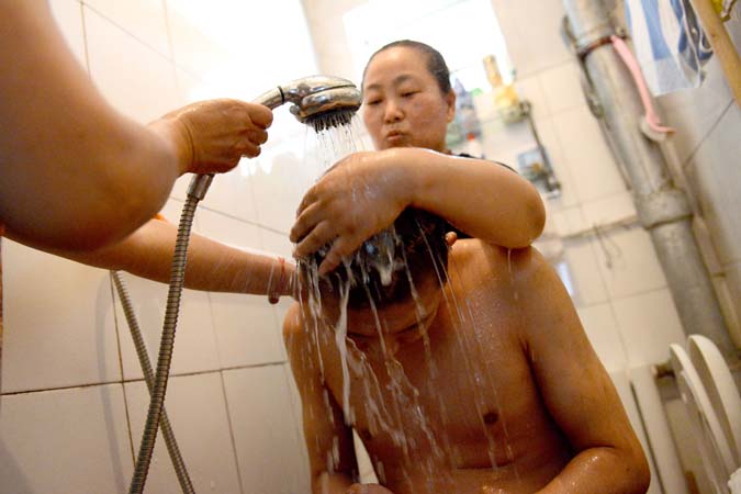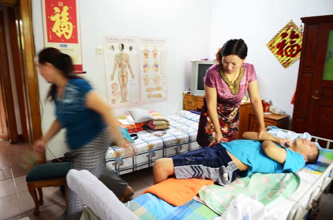房愛(ài)玲為防止兒子得上褥瘡,每天都為兒子擦拭全身。