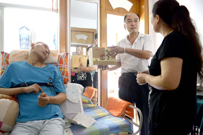 愛(ài)心人士馮先生(中)向王翀的母親介紹保健品的使用方法。當(dāng)天,馮先生一行來(lái)到房愛(ài)玲家中,給王翀送去了募捐的善款和保健品。