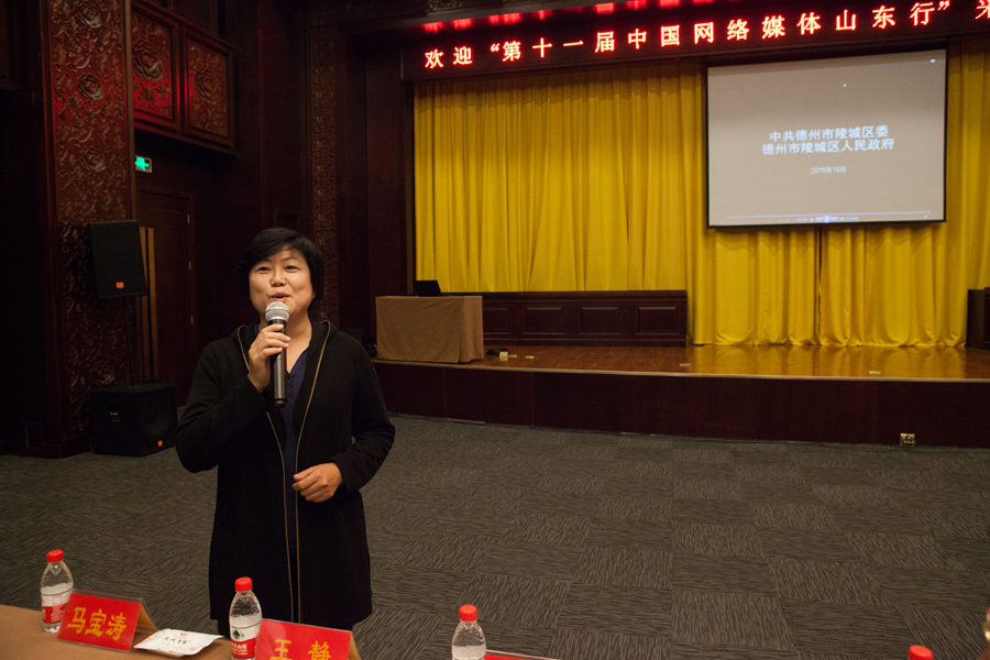 陵城區區委書記、區人大常委會主任馬俊昀向采訪團記者介紹陵城區發展情況(大眾網 撒偉 攝)