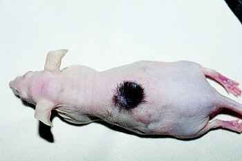 大部分小老鼠鼠皮上沒有毛發(fā),皮膚呈裸色。小老鼠背上有一塊一寸見方的皮膚顏色略深,上面長著黑色毛發(fā)。