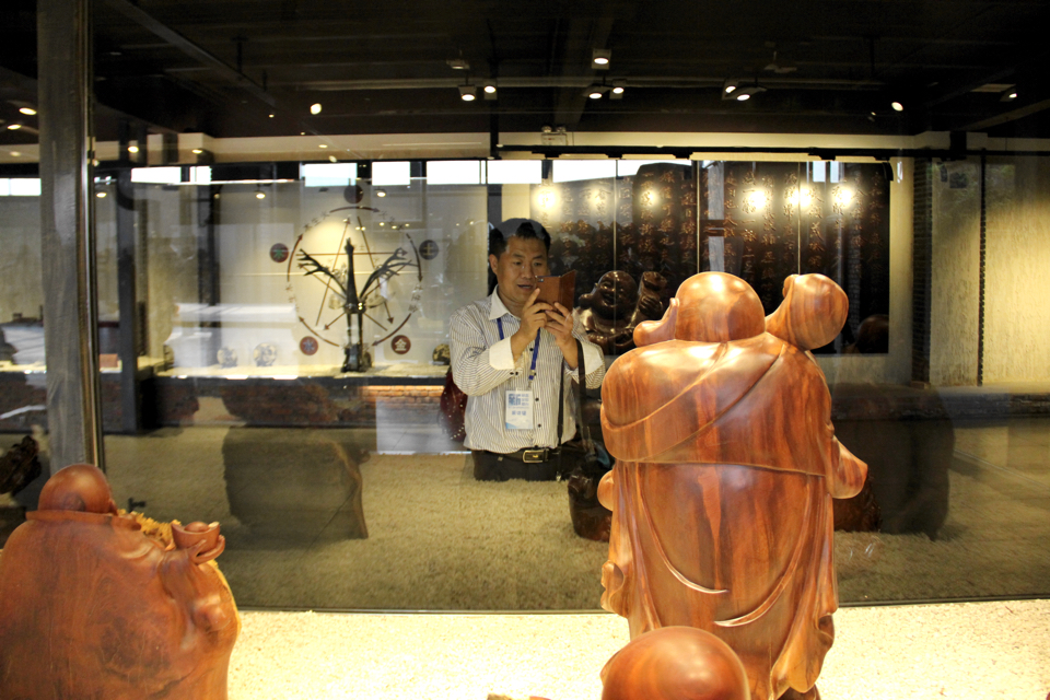 臨沂木業產業服務中心的木制工藝品吸引了采訪團記者的鏡頭。大眾網記者 攝