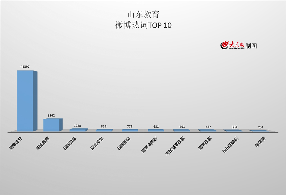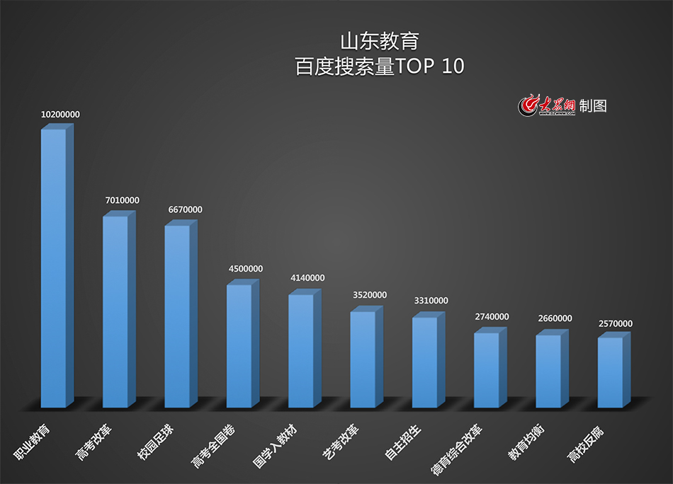 大眾網(wǎng)濟(jì)南5月8日訊(記者 姜洋)教師、課程、考試...教育可謂是充斥著所有人的生活。大眾網(wǎng)通過(guò)大數(shù)據(jù)分析得出,一年來(lái),“職業(yè)教育”、“高考改革”、“校園足球”成為網(wǎng)友們最關(guān)注的問(wèn)題,在百度搜索上躋身前三名;而“高考加分”則成為微博上最熱的教育話題。