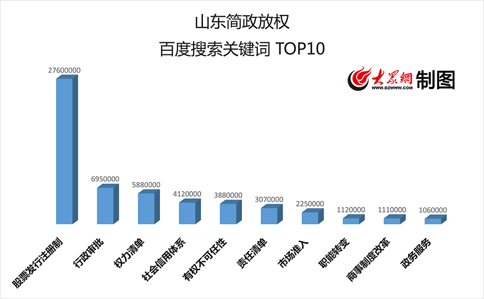 大眾網濟南5月21日訊(記者 馬俊驥)有權也不能任性、把權力關進制度的籠子里……權力如何行使對老百姓生活的方方面面都會產生深遠的影響。大眾網通過大數據分析發現,近一年來,“股票發行注冊制”是網友搜索近三千萬次的簡政放權“熱詞”,而“行政審批”和“政務服務”則是網友在微博上討論最多的“關鍵詞”。