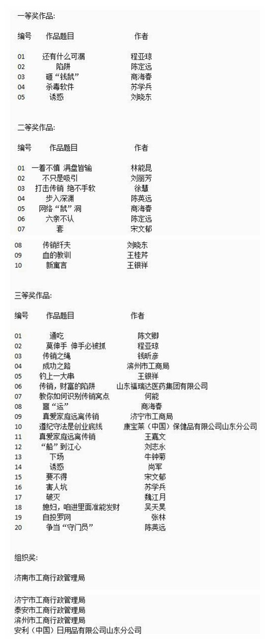 山東省工商局公布“打擊傳銷規(guī)范直銷”參賽作品獲獎(jiǎng)結(jié)果
