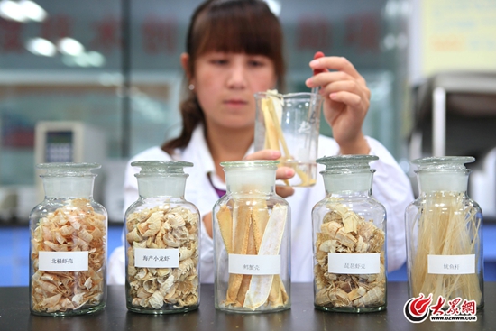 即發(fā)集團的技術(shù)人員在檢測海洋生物甲殼原料成分。近年來,企業(yè)自主研發(fā)了從蝦蟹等海洋生物中提取“海洋生物甲殼素纖維”技術(shù)。這種纖維已被用于服裝服飾產(chǎn)品制造。該項技術(shù)曾榮獲國家科技進步二等獎和中國優(yōu)秀發(fā)明專利