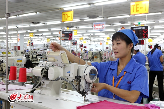 一名即發(fā)集團的縫紉女工在生產(chǎn)高檔女裝產(chǎn)品。