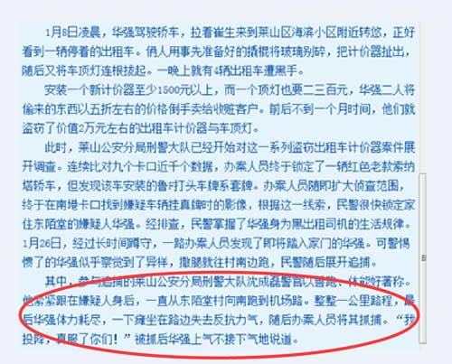 2014年1月,沈成磊抓捕盜竊出租車計價器、頂燈案時,追出一公里,累癱了盜賊。媒體報道截圖