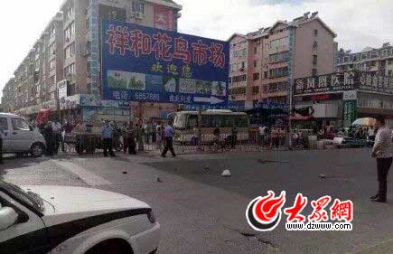 “因為當時他們三個人都穿著便衣,大家都不知道是警察在抓壞人,所以雖然有人路過或看到,卻并不敢輕易上去幫忙。”李大爺告訴大眾網(wǎng)記者說,持刀的小伙看上去有一米八多,很魁梧,兩名便衣民警相比起來則有些瘦弱。其中一名民警被刺中后倒地,脖子不住地流血,一名市民上前按住他的脖子,還試圖幫忙止血,另一名民警撥打了120叫救護車。還沒等120趕到現(xiàn)場,一輛私家車路過,車主幫忙將受傷的民警抬上車,往中醫(yī)院方向駛去。保潔員陳師傅告訴大眾網(wǎng)記者說,那位受傷的民警倒地后掙扎著向前爬了兩下,但頭部、頸部很快滲出大量鮮血,很快就不能動了。
