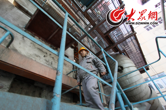 這對“父子兵”中的父親林慶亮在濟南市南郊熱電廠已經(jīng)工作了29年了,2000年金雞嶺熱電廠投入使用后,他便從南郊熱電廠老廠調到這邊來工作。18日早晨8點20分,林慶亮開始爬這個30多米高的水塔,檢查水壓、水位等。