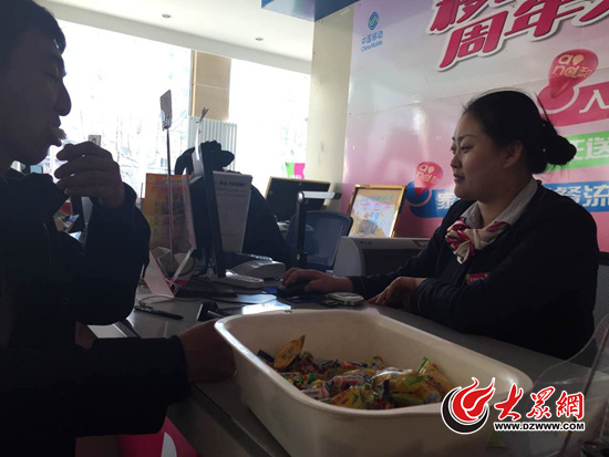 春節(jié)期間,營業(yè)廳里為辦理業(yè)務(wù)的市民準(zhǔn)備了糖果,讓很多市民“沾喜氣”。記者 馬俊驥 攝