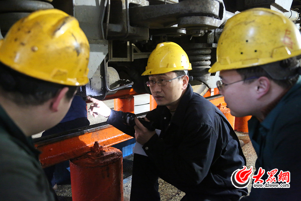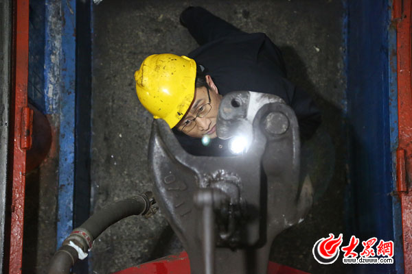 3.“火眼金睛”的江山正在認(rèn)真檢查機(jī)車車鉤各部狀態(tài)。