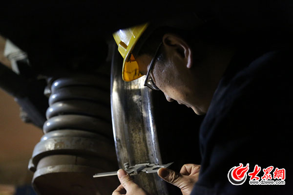 7.工作中,江山要對(duì)機(jī)車走行部關(guān)鍵部位輪對(duì)輪緣厚度實(shí)施二次測(cè)量確認(rèn)(就是職工測(cè)量完一遍,他再確認(rèn)一遍),確保測(cè)量數(shù)據(jù)準(zhǔn)確,對(duì)超限的輪對(duì)及時(shí)更換,防止機(jī)車脫線。一臺(tái)車要檢測(cè)12個(gè)輪子,大約需要30分鐘。