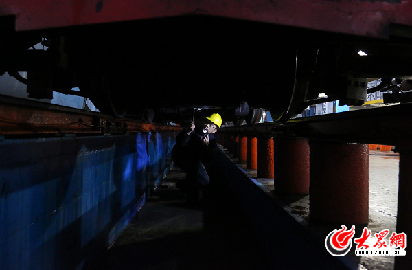 13.江山再一次鉆進(jìn)地溝,對(duì)當(dāng)天最后一臺(tái)機(jī)車進(jìn)行交車前的復(fù)查確認(rèn)。每進(jìn)一臺(tái)車,他都要先檢查一遍,職工作業(yè)完畢后,他還要再?gòu)?fù)查一遍,加上整修期間和職工一塊鉆地溝測(cè)量數(shù)據(jù)、確認(rèn)活件整修情況等。這已是他當(dāng)天第11次鉆進(jìn)地溝了,大約要起蹲150余次,工作5個(gè)多小時(shí)。