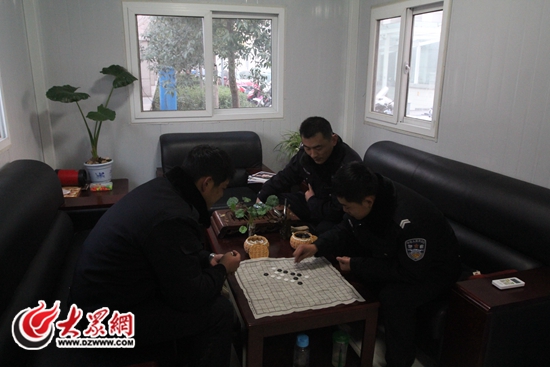 執勤的空隙,交警們在下棋。 大眾網記者 劉明明 攝