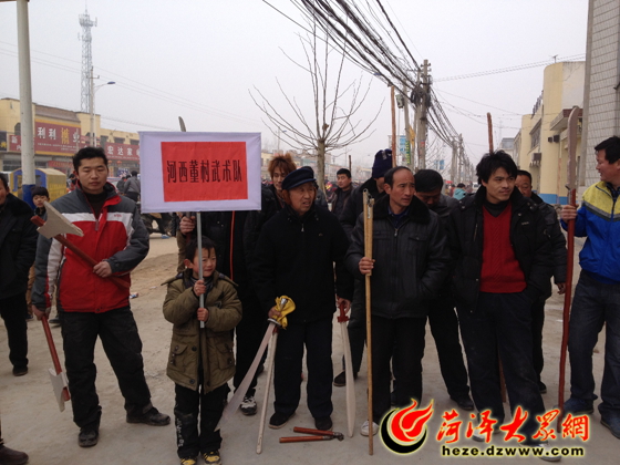 在表演的隊伍里,一支來自河西董村的武術隊吸引了數百名群眾駐足觀看,練拳、舞刀弄槍、踢腿、翻跟斗……從最小的6歲到最大的68歲,一時間老的少的, 各種花樣輪番上陣,引來了陣陣叫好聲。據了解,他們學的是夕陽拳,教他們的是夕陽拳當代傳人董傳現,是位遠近聞名的“武林高手”,已經義務教學30多年了,弟子達400多人。