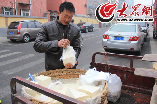 大眾網(wǎng)濟(jì)南2月4日訊(記者 韋輝)“熱豆腐嘍!”臨近年根,家家戶戶在準(zhǔn)備年貨的時(shí)候,大魚大肉不能少了,豆腐、年糕這樣的“小菜”也不能沒有。豆腐和年糕由于諧音是“都富”、“年年高”這樣吉祥又有節(jié)日氣氛的名字,春節(jié)期間也成了“搶手貨”。大年三十,是34歲的“豆腐哥”李順昌蛇年出攤的最后一天,這天他賣掉了5筐共350斤的豆腐。
