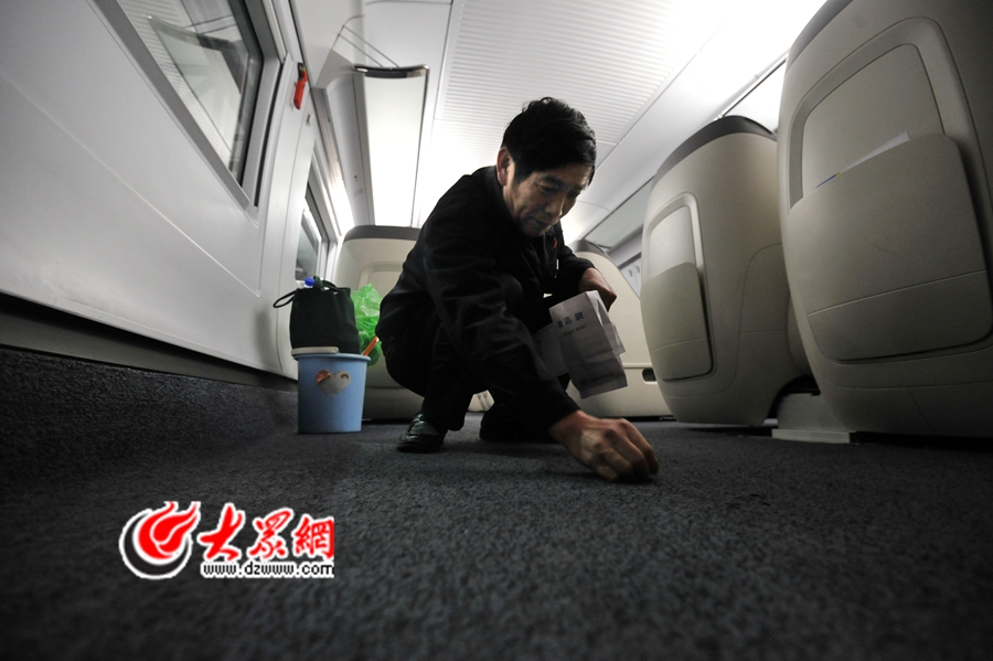 由于部分車廂內(nèi)的地面是地毯式的,車內(nèi)的光線比較灰暗,加之地板上一些細(xì)微的雜物不容易用肉眼發(fā)現(xiàn),55歲的內(nèi)保潔職工雙膝跪在地上,用手觸摸著燈光照過的每一寸地面。