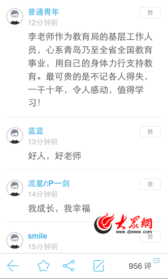 大眾網報道在山東24小時客戶端刊發后,同樣受到網友的一直好評。截至11日晚21時,閱讀量已達11680次,評論達989次。網友“普通青年”在留言中說:“李老師作為教育局的基層工作人員,心系青島乃至全省全國教育事業,用自己的身體力行支持教育。最可貴的事不計個人得失,一干十年,令人感動,值得學習!”網友“幽幽”也說:“好有愛!付出那么多!有責任心!”