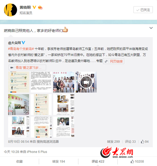 6日10:28,黃曉明在微博上轉發了@大眾網對“支教島”報道的微博,他在轉發時評論說:“燃燒自己照亮他人,家鄉的好老師們”,并豎起大拇指為“支教島”點贊。大眾網記者看到,黃曉明轉發微博一個小時之內,該微博的閱讀數已突破100萬,網友點贊超過1萬次。網友@望雀山莊說:“點贊并提前祝老師們教師節快樂!盄佟心穎star_沐溢說:“我的青島棒棒的,等我有時間了也去做義工!本W友@想突變到172cm的肖亞瓊說:“真為自己是青島人感到自豪!
