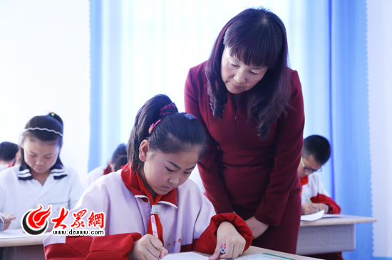 李淑芳在平度一小學(xué)送課時,在課堂上對小學(xué)生進行指導(dǎo)。(亓翔 攝)