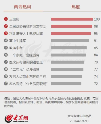 今天,大眾輿情中心發(fā)布第一期“兩會(huì)每日熱詞榜”。“王國(guó)慶”“全國(guó)政協(xié)首場(chǎng)新聞發(fā)布會(huì)”“別讓嫌疑人上電視認(rèn)罪”分別以100、98和95的熱度進(jìn)入熱詞榜前三名。